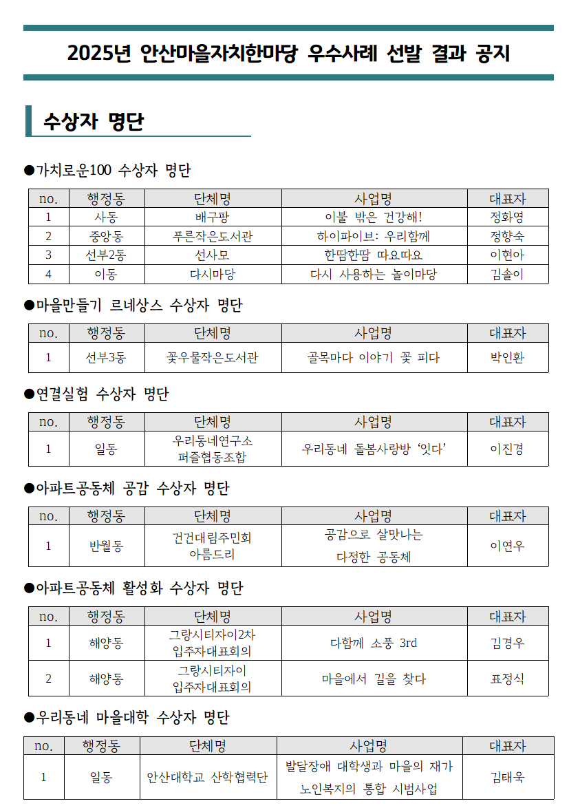 2025 안산시마을만들기지원센터 주민공모사업 '우수사례 10선' 선정 결과 발표
