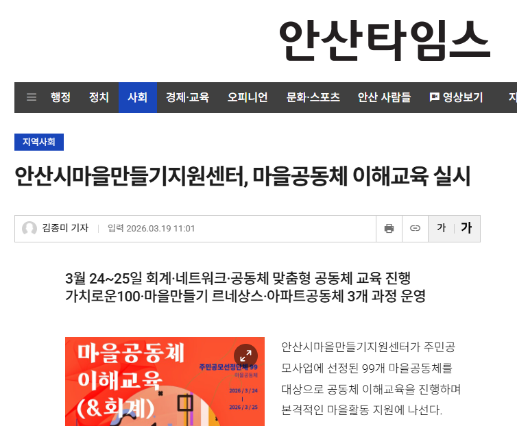 센터는 오는 3월 24일부터 25일까지 이틀간 마을공동체지원센터 4층 다목적홀에서 ‘2026년 마을공동체 이해교육 및 회계교육’을 개최한다고 밝혔다.