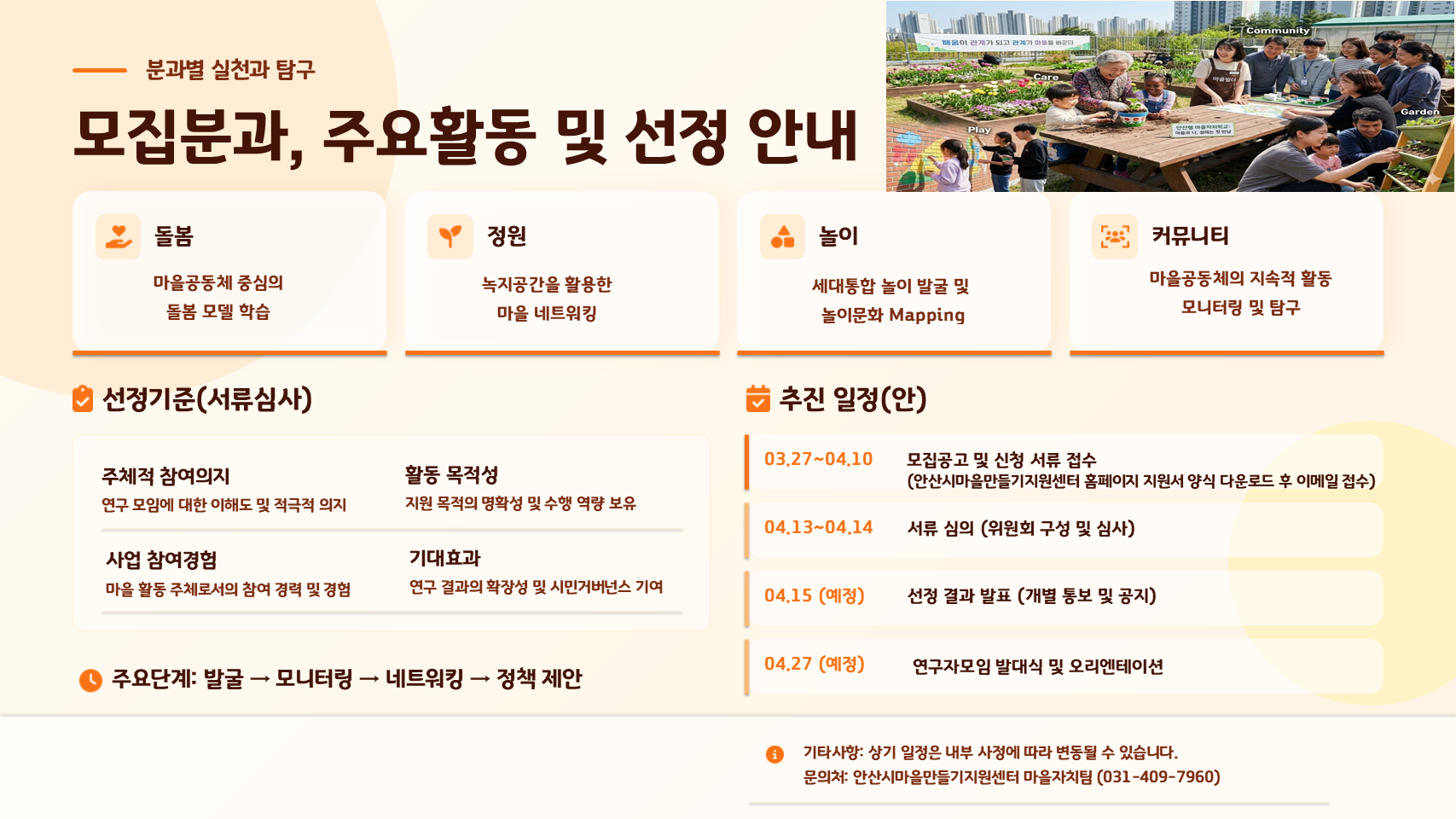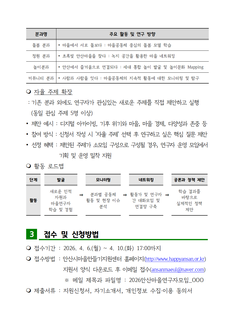 접수방법 : 안산시마을만들기지원센터 홈페이지(http://www.happyansan.or.kr) 지원서 양식 다운로드 후, 이메일 접수(ansanmaeul@naver.com)
