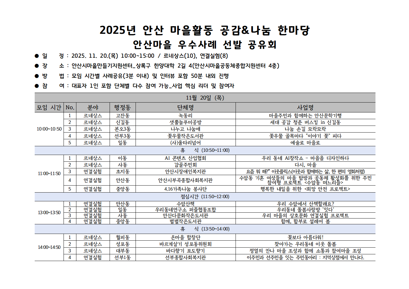 공지 2025년 안산 마을활동 공감&나눔 한마당 : 안산마을 우수사례 선발 공유회 (르네상스,연결실험)-20일진행