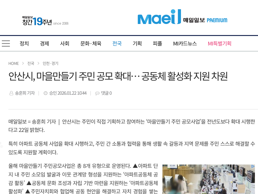 매일일보 = 송훈희 기자 | 안산시는 주민이 직접 기획하고 참여하는 ‘마을만들기 주민 공모사업’을 전년도보다 확대 시행한다고 22일 밝혔다. 특히 아파트 공동체 사업을 확대 시행하고, 주민 간 소통과 협력을 통해 생활 속 갈등과 지역 문제를 주민 스스로 해결할 수 있도록 지원할 계획이다.