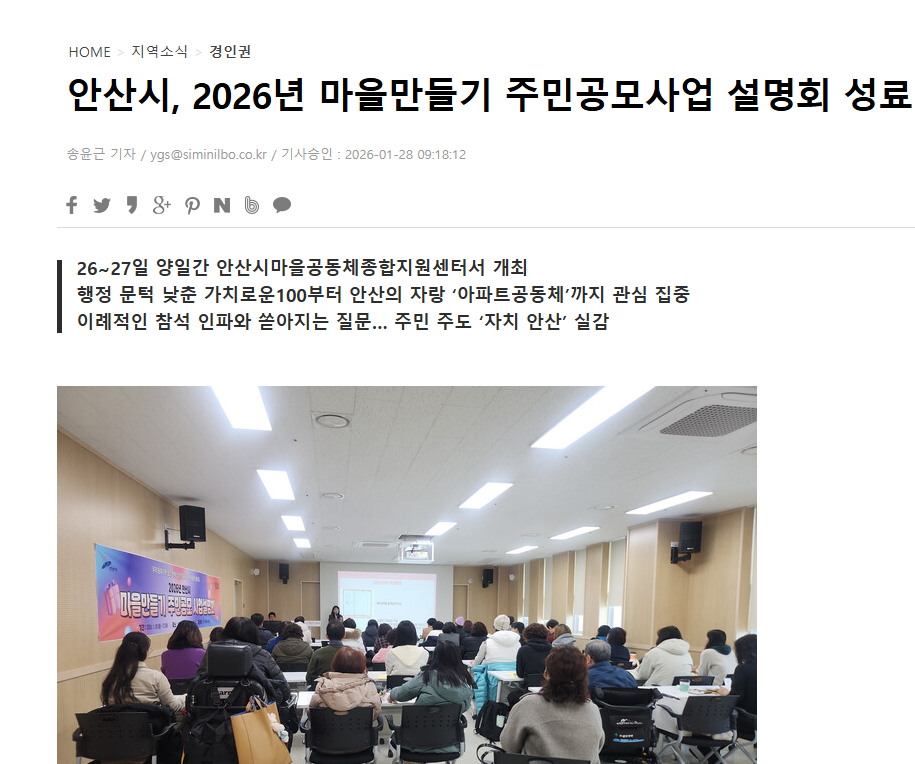26~27일 양일간 안산시마을공동체종합지원센터서 개최 행정 문턱 낮춘 가치로운100부터 안산의 자랑 ‘아파트공동체’까지 관심 집중 이례적인 참석 인파와 쏟아지는 질문… 주민 주도 ‘자치 안산’ 실감
