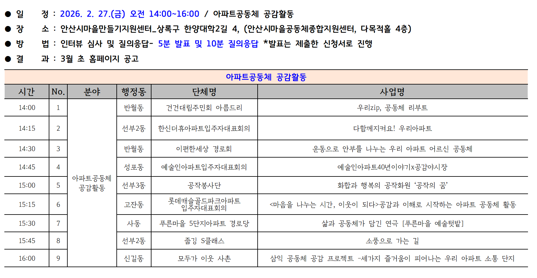 공고[2026-05호] 2026년 안산시 마을만들기 주민공모사업 서류심사 결과 및 인터뷰심사 안내